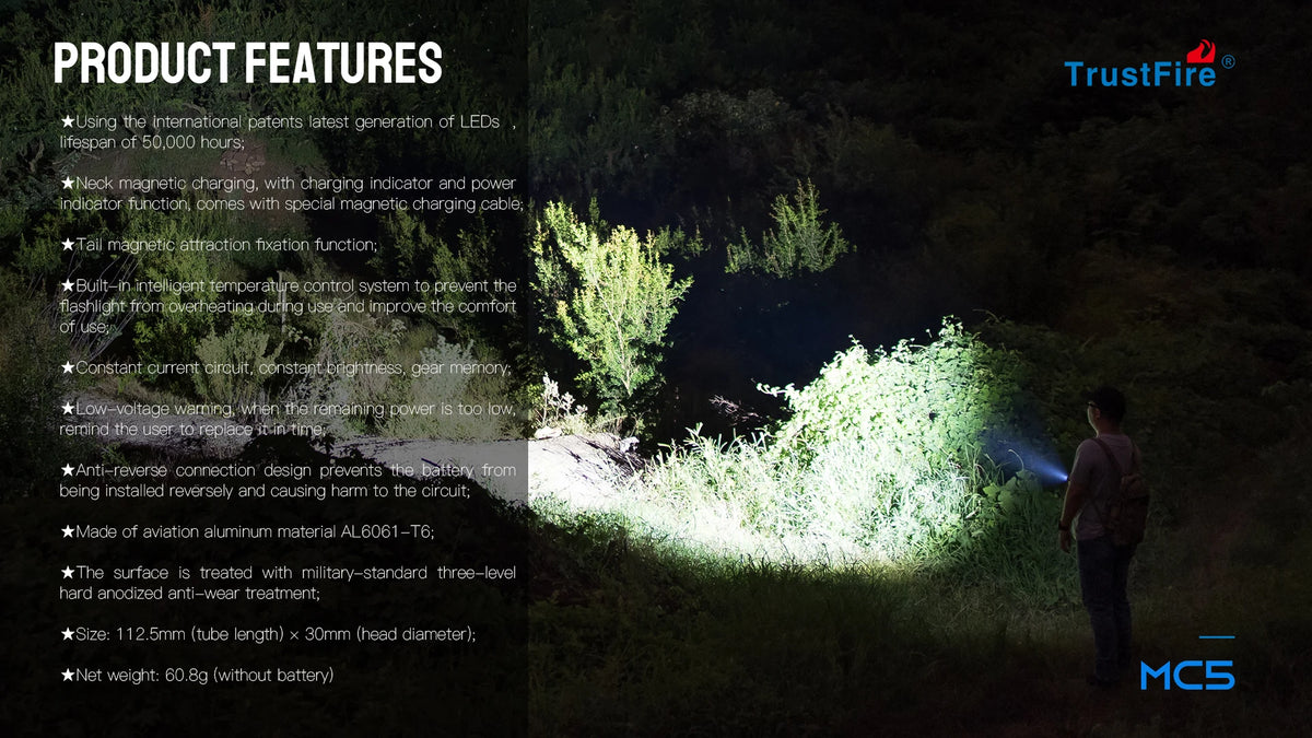MC5 adopts the latest generation of internationally patented LED, with a life span of 50,000 hours, defying the darkness and illuminating your way forward.